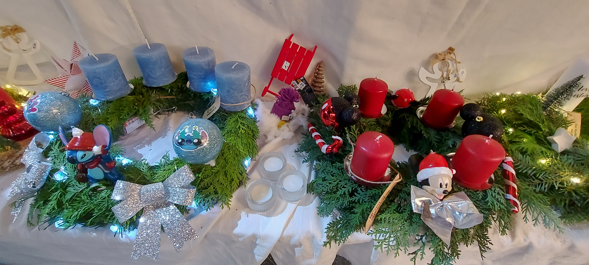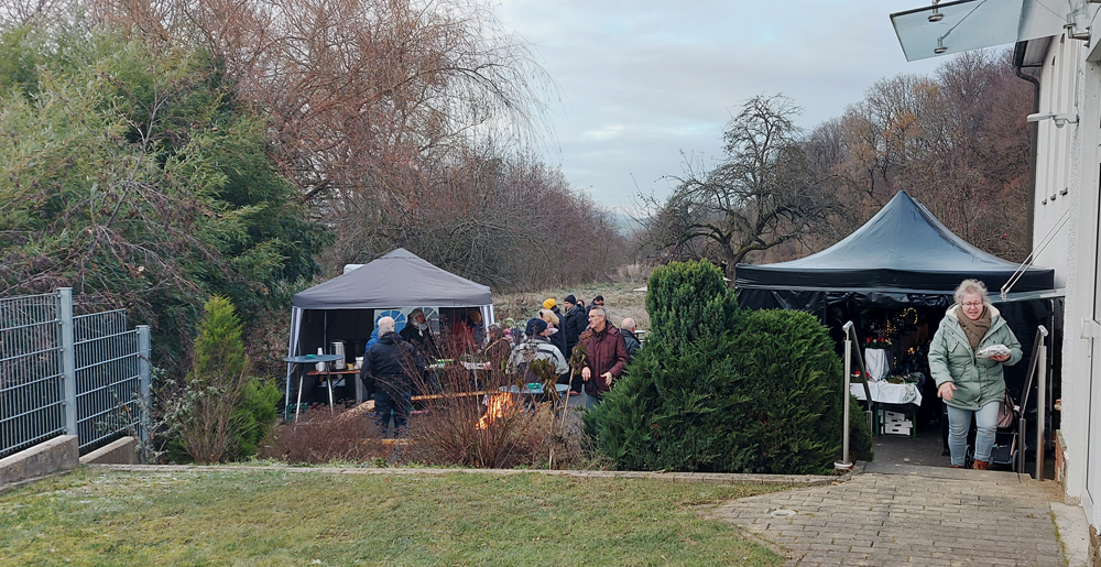 Es war das richtige winterliche Wetter für diesen Basar. Die beiden Feuerschalen verströmten wohltuende Wärme. Tanja und Leonie, die draußen selbst hergestellten (Edelstahl) Schmuck anboten, machte die Kälte offenbar wenig aus. Die übrigen schönen Dinge waren im Zelt ausgestellt. Mit haben die Kränze sehr gut gefallen: Sehr verschiedenartig, von hoher Qualität und zu Preisen, dass sich fast jeder solch einen Adventskranz leisten konnte.
