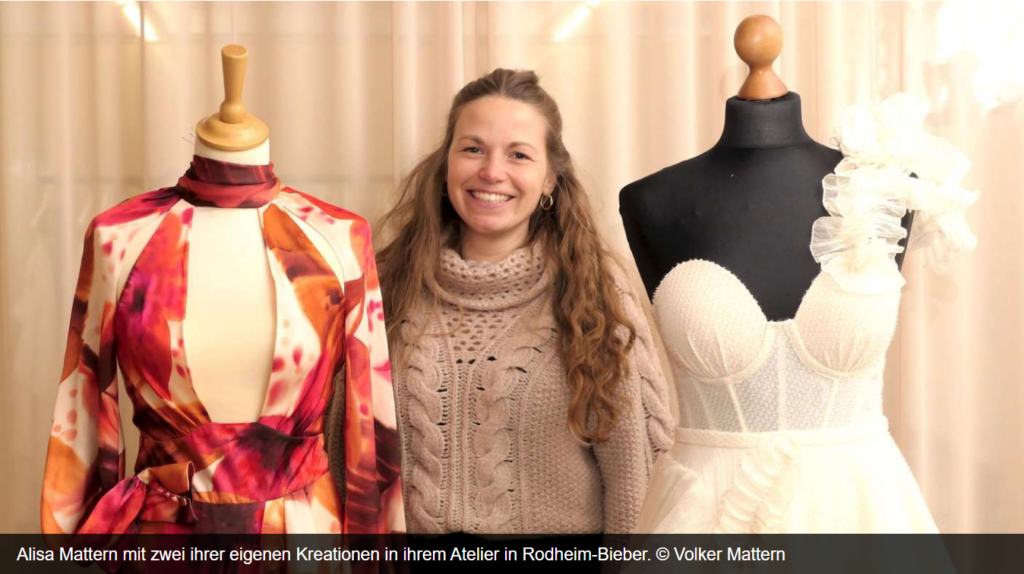 Volker Mattern schrieb in seinem Artikel in der Gießener Allgemeinen: Die beiden Omas von Alisa Mattern wären stolz, ihre Enkelin auf der Pariser Fashion Week zu wissen; aber Stolz waren Hilde Mattern und Sophie Dörfler ohnehin bereits zu ihren Lebzeiten. Schon bald stand der berufliche Weg der Enkelin fest, denn Nähen und Schneidern wurde der Fellingshäuserin sozusagen in die Wiege gelegt. Am Anschauungsunterricht der Omas und deren Fingerfertigkeiten, deren Geschick im Umgang mit Nadel, Zwirn und Schere entdeckte sie ihren Spaß am Handwerken schon früh. Mit den eigenen Händen etwas zu schaffen, um für sich und auch zur Freude anderer Menschen etwas zu bewegen, so stand der Plan. Was zunächst mit dem Fachabitur in Textiltechnik und Bekleidung 2008 begann, wurde vier Jahre später mit dem Absolvieren der Schneiderausbildung besiegelt und 2014 dann mit der erfolgreichen Meisterprüfung. Doch damals hätte sich die heute 35-Jährige nicht träumen lassen, einmal ihr Können in Paris, der Hauptstadt der Mode, zeigen zu dürfen. Allerdings konnte man im Schaufenster ihres kleinen Geschäftes in Rodheim verfolgen, wie sich die Ausstellungsstücke über die Zeit von 10 Jahren veränderten und wie sehr, auf Facebook zu sehen, die Augen der Bräute in Alisas Kleidern leuchteten.