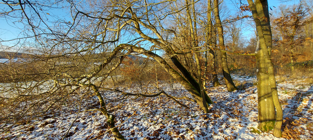 Am Waldrand oberhalb gibt es ein gutes Beispiel für die Widerstandsfähigkeit und den Neuaustrieb. Einige Stämme waren vor Jahren schon umgebrochen. Sie sind aber bogenförmig ausgetrieben und haben Ausläufer gebildet. Unten drunter ließe sich im Sommer wunderbar spielen. Aber es ist eher selten, dass dort oben noch Kinder umherstreifen. Schade!