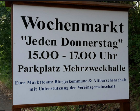 … an der Mehrzweckhalle in Fellingshausen, Rodheimer Str. 24; nahe dem allwöchentlichen Wochenmarkt hinter der MZH, der Ende Oktober 2025 seine 660. Auflage feiern kann. Nachdem der REWE-Markt in Fellingshausen geschlossen wurde, hat sich die Initiative „Fellingshäuser Wochenmarkt“ daran gemacht, diese Einkaufsmöglichkeit mit Marktbeschickern zu organisieren und einen Treffpunkt im Dorf mit Stammtisch und Kuchen-Buffett zu schaffen.