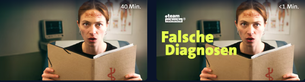 Im Disclaimer zum Beitrag heißt es: „Stell dir vor, deine Krankenversicherung wirft dich plötzlich raus – und du bist von einem auf den anderen Tag nicht mehr krankenversichert. Oder du wirst berufsunfähig, aber deine Berufsunfähigkeitsversicherung zahlt nicht. Ärzte nehmen dich in der Behandlung womöglich nicht so richtig ernst und du weißt nicht, warum. Der mögliche Grund: Fragwürdige Diagnosen in deiner Krankenakte – zu Krankheiten, die du nie hattest: Hypochondrie, Angststörung, Kieferbruch – alles ist möglich. Die Journalistinnen Berit Kalus, Melanie Schoepf und Jana Heck des WDR-team.recherche decken auf, wie falsche Diagnosen entstehen, wie sie in deiner Krankenakte landen und was sie für Betroffene bedeuten können. Dahinter steckt ein hochkomplexes und fehleranfälliges Abrechnungssystem, in dem Ärzte aufgrund von Zeitnot, Unwissenheit und manchmal auch fragwürdigen Motiven falsche Diagnosen eintragen. Mit immer wieder verheerenden Konsequenzen für die Patienten. Und jetzt, mit der elektronischen Patientenakte, könnte sich das Problem sogar verschärfen…“