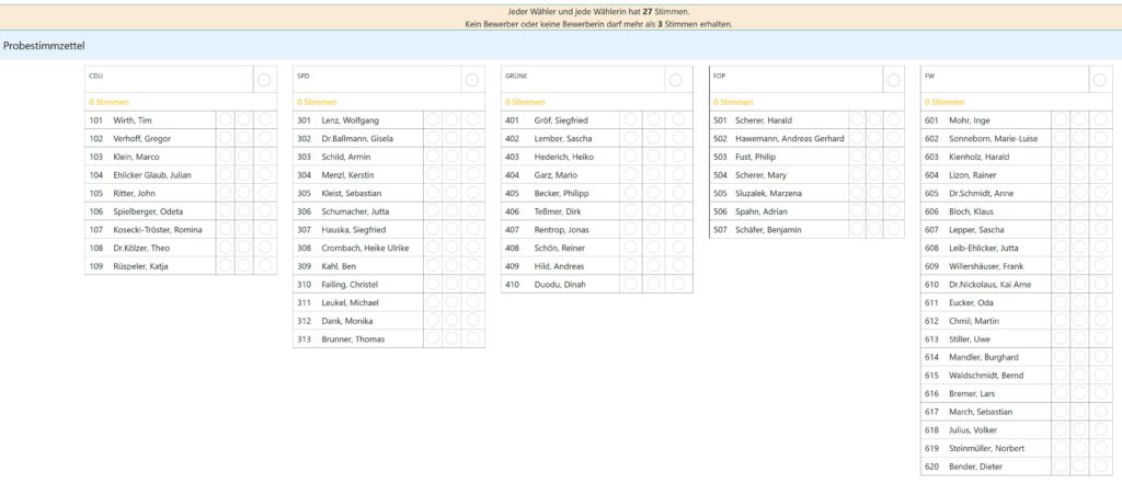 Hinter den Namen sind drei Kreise eingezeichnet. Parteiübergreifend dürfen Sie maximal drei Kreuze pro Kandidat/in setzen, bis Ihre 27 Stimmen verbraucht sind (panaschieren). Sie können aber auch Ihre Stimmen auf die Bewerber/innen nur einer Partei verteilen (kumulieren).