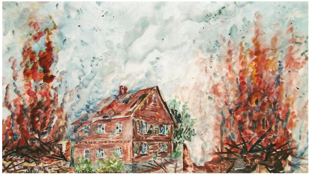 Da der Bilderbogen zu seinen Beiträgen mindestens ein Bild oder ein Video veröffentlich, wurde in diesem Artikel ein Foto nach einem Gemälde von Reinhold Kerl gewählt, das wir einem Artikel von Klaus Waldschmidt in der Gießener Allgemeinen vom 10 März 2020 entliehen haben. Denn es gibt aus der damaligen Zeit keine Fotos vom Bombenangriff am 14. März 1945, zwei Wochen bevor die Amerikaner in Bieber einzogen und zumindest dort den