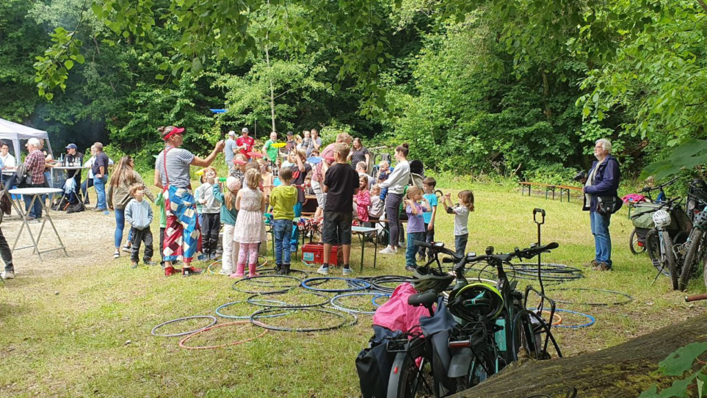 Hier sitzen Alt und Jung an diesem schönen Platz im Wald beieinander. Nach einem Gottesdienst mit Pfarrer Daniel Schweizer spielte ab 12.30 bis zum Abend der Volksmusikverein Wettenberg auf. Für die ganz Jungen sorgten in diesem Jahr der Clown Ichmael und ein Angebot an Spielgeräten der Zirkusscheune aus Pohlheim für Freude und Unterhaltung.