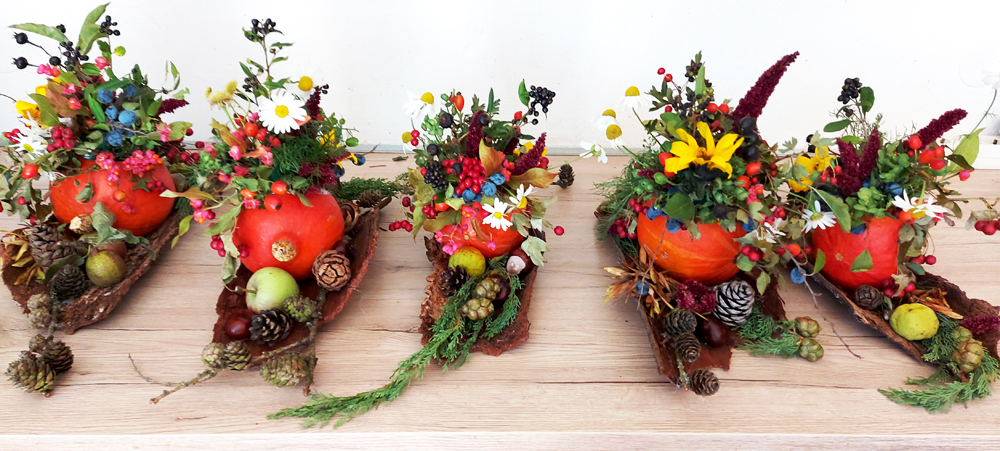 Für die Gestecke zur 40-Jahr-Feier des Natur-und Vogelschutzvereins Fellingshausen habe ich unterwegs alle Früchte aufgesammelt, die zum Thema passen. Hagebutten, Weißdorn Schlehen, Pfaffenhütchen und Schneeball-Früchte wollte ich aber frisch verwenden und bin in Biebertal umher gefahren, um kleine Mengen abzuschneiden. Das war gar nicht einfach, es gibt nämlich kaum noch Wildstrauchhecken. Natürlich wurden auch hier mal Hecken gepflanzt, doch das liegt Jahrzehnte zurück. In der Heckenpflege kennt man den Begriff „auf den Stock setzen“ oder aus Schleswig-Holstein den „Knick“. In beiden Fällen werden die Heckenpflanzen nach etwa 10 Jahren verjüngt. Früher nutzten die Menschen das dabei gewonnene Holz zum Heizen und verwendeten auch die Wildfrüchte selber. Für die Tiere blieb noch genug übrig. Vor allem im Norden waren die Knicks/Wallhecken wichtig, um den Wind abzufangen und damit ein Wegfliegen der wertvollen Ackererde zu verhindern. Heute sind die Hecken wegen der großen Landmaschinen bei der Feldbewirtschaftung hinderlich.