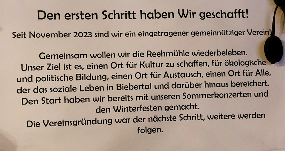 Der Verein Reehmühle e.V. wurde 2023 gegründet. Zur Zeit wohnen 17 Personen zwichen 28 und 42 Jahren in dem alten Mühlenensemble. Ihr Ziel ist es, dort viele Kulturveranstaltungen durchzuführen.