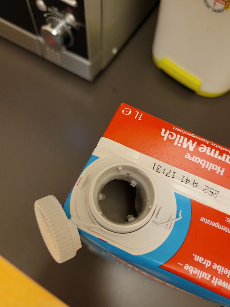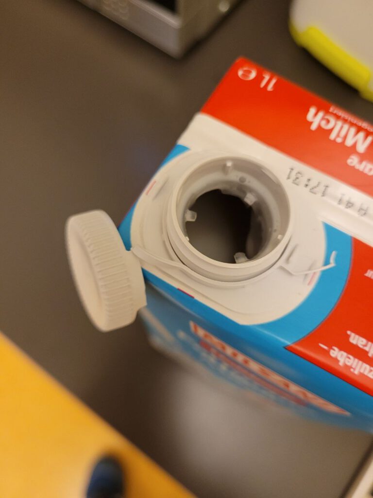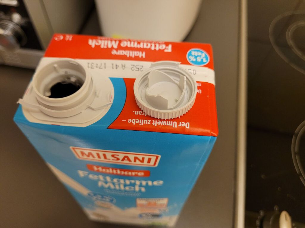 Hallo zusammen. ich weißt nicht wie es euch allen geht. Aber, mich nervt der Deckel an den Getränken (hier bei der Milch). Ich mache die meistens ab. Denn, wenn ich etwas einschütten möchte, kommt fast immer der Deckel mit ins „Spiel“ und es platscht etwas daneben. Ich finde diese „Erfindung“ nicht gut.