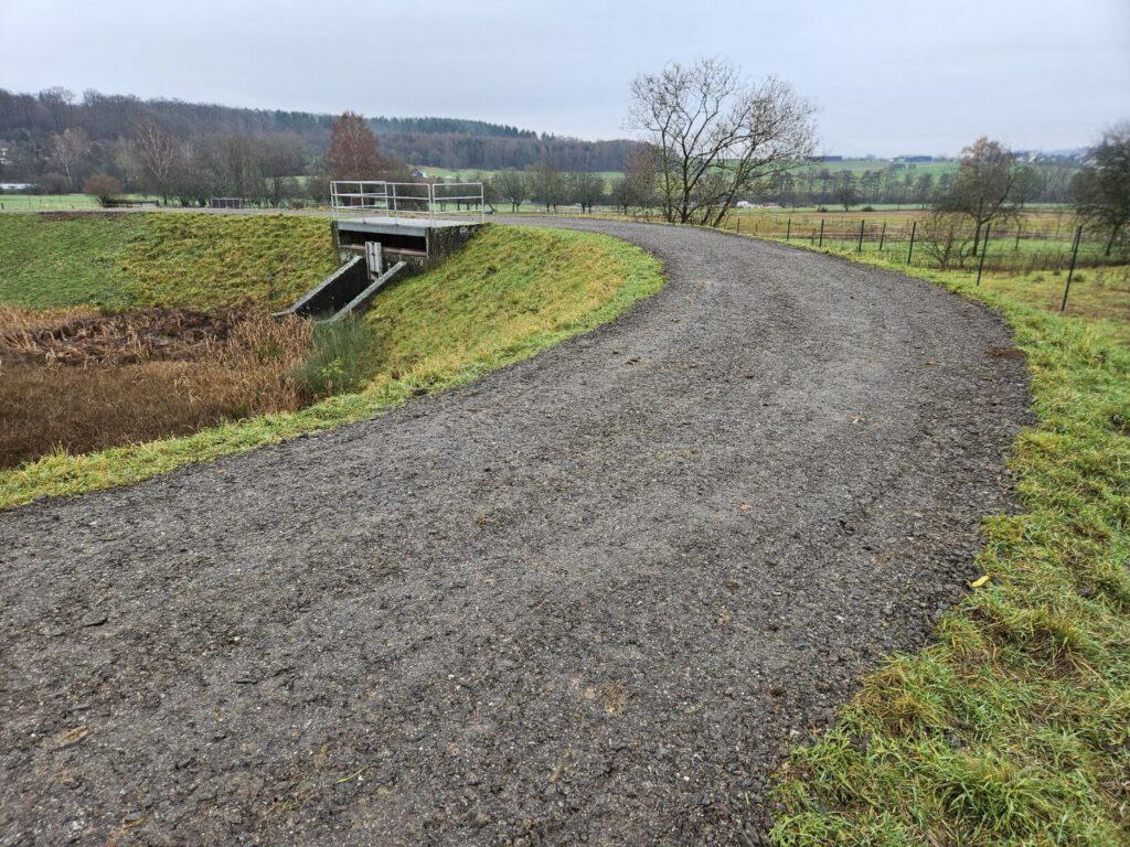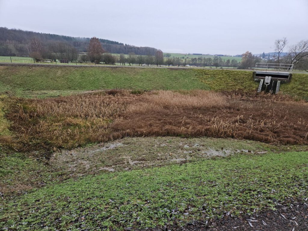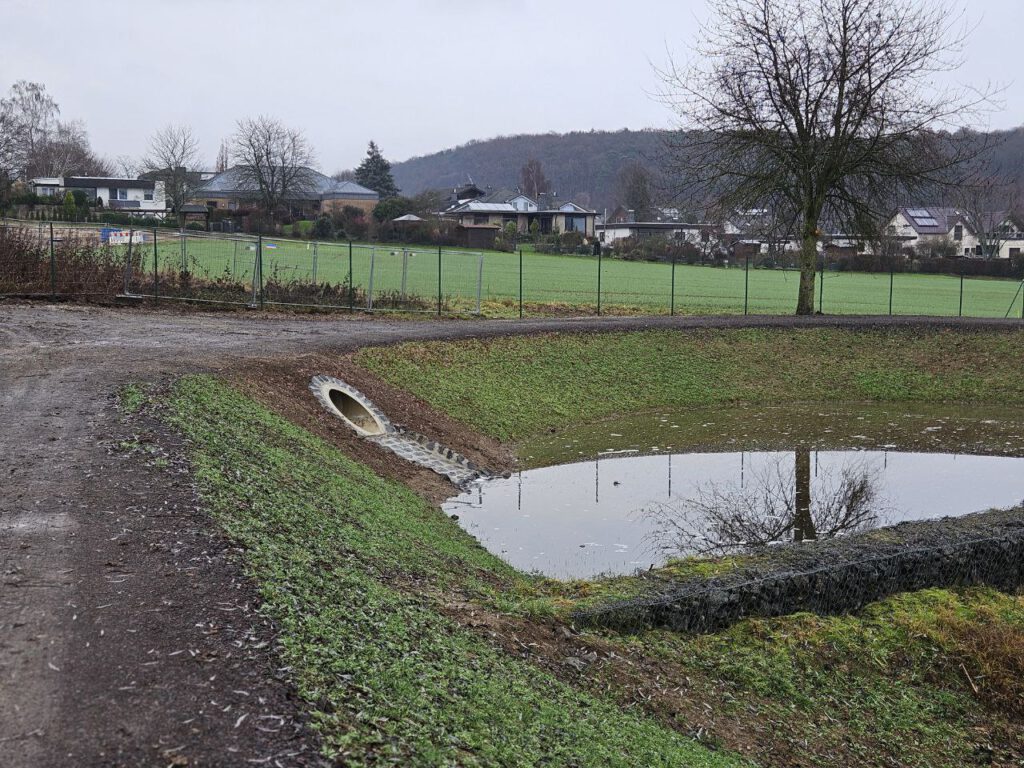 Die notwendige Infrastruktur für die zukünftige Bebauung wird dabei in den Boden gebracht. So läuft nun auch wirklich Wasser in das Regenrückhaltebecken, das bislang eher von einem Rinnsal geflutet wurde.