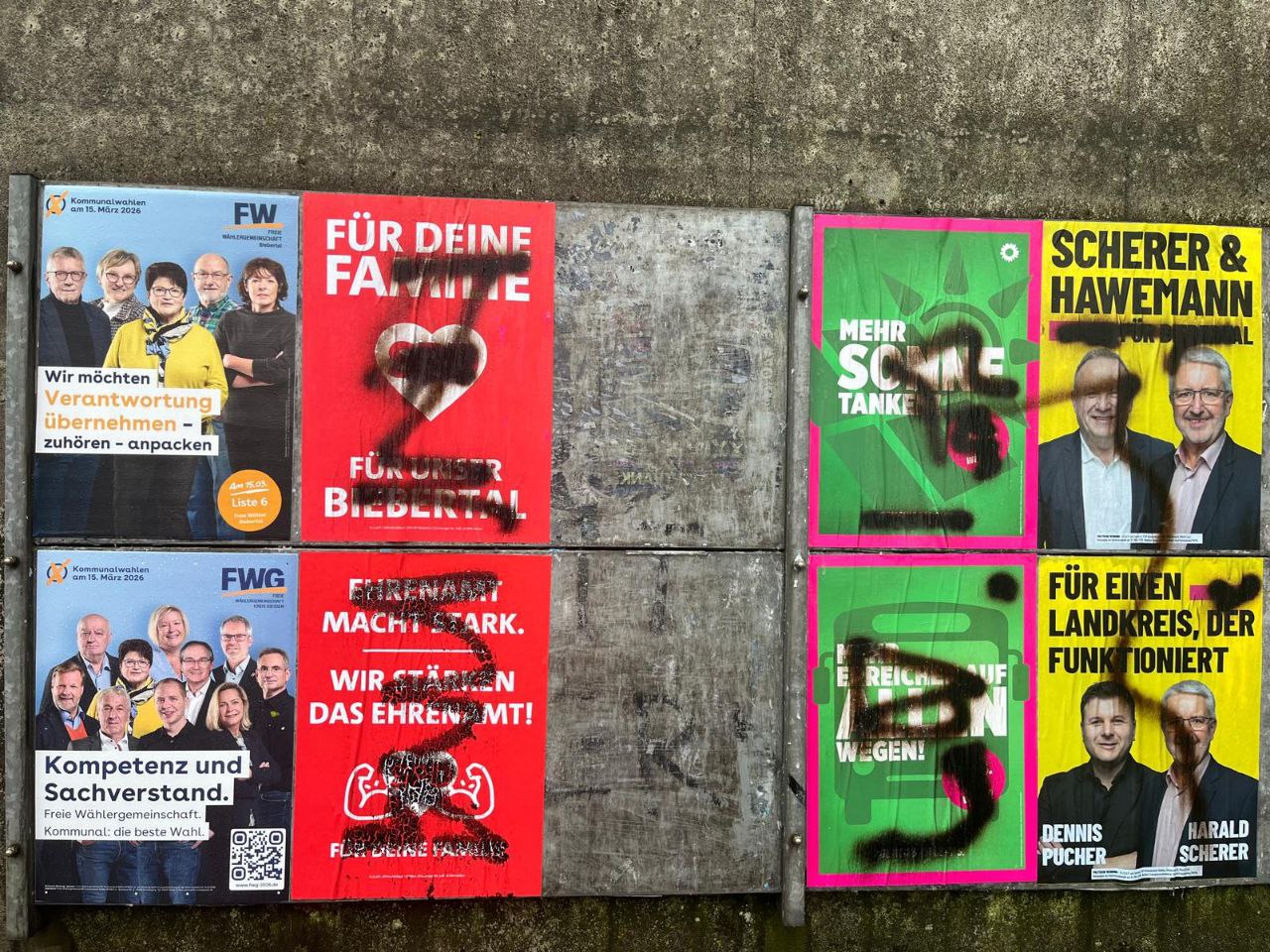 Gefunden wurden diese Schmierereien auf dem Weg vom Bauernhof March, entlang der Straße über das Schwimmbad, bis in die Schulstraße in Bieber.
