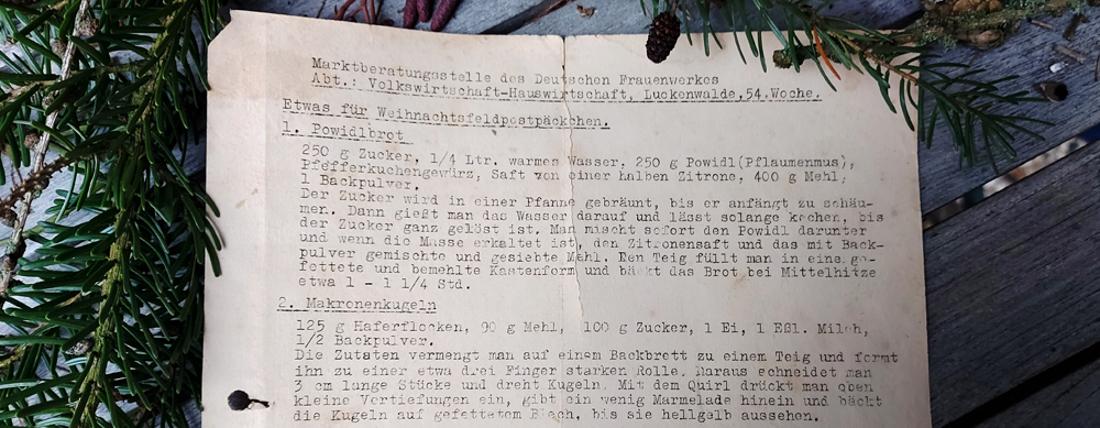 Weihnachtsdekoration gesucht und dabei einen Schnellhefter mit Rezepten gefunden. Er stammt noch von meiner Mutter. Etliche lose Blätter aus den 1950er Jahren. Dr. Oetker ist am häufigsten vertreten, dann die Gewürzmühle Staesz bei Bremerhaven, wo wir zeitweilig wohnten. Am interessantesten finde ich ein Blatt, das offensichtlich mittels einer Wachsmatrize vervielfältigt wurde. Es stammt von der