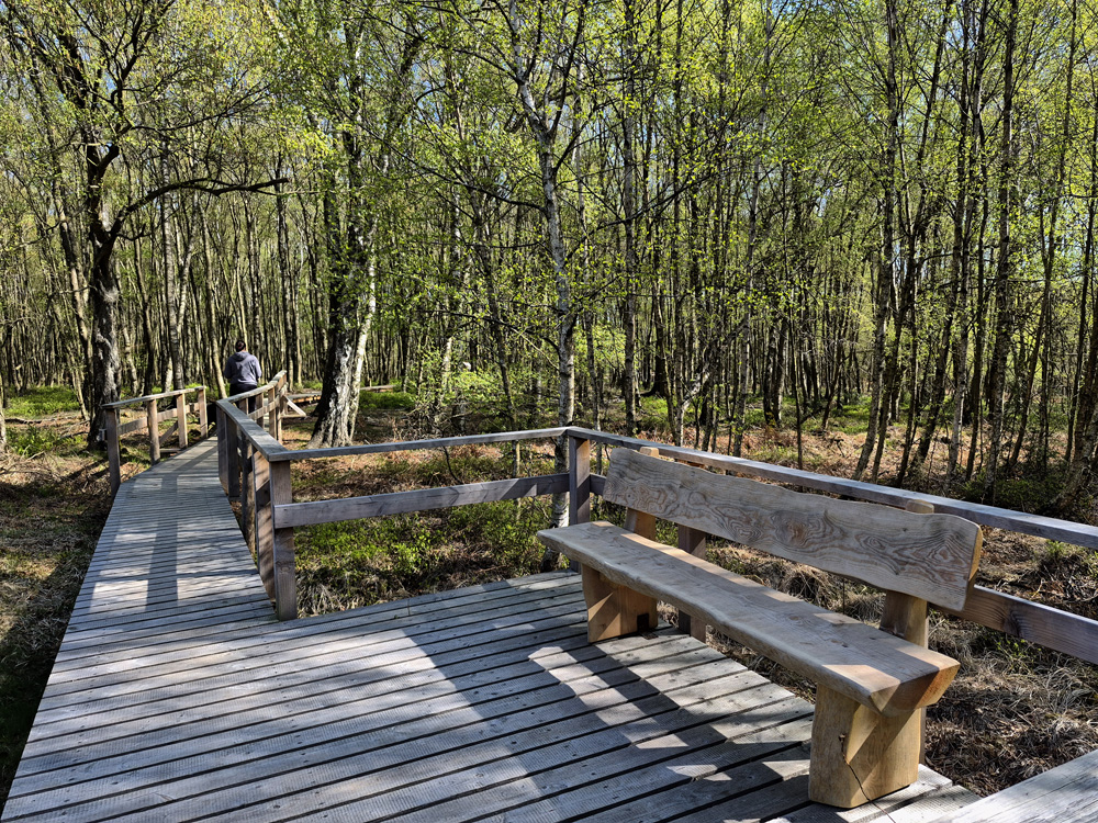 Seit 11 Jahren wohnt meine Tochter in dieser Gegend; und schon öfter sind wir den Plankenweg gegangen, erst recht seit er im vergangenen Jahr komplett erneuert wurde. Kaum habe ich ihn betreten, merke ich die Wohltat für die Fußgelenke. Die frei aufgehängten sehr soliden Stege federn bei jedem Schritt, und die Entlastung der Füße ist sofort spürbar. Die Stege sind breit, stabil mit gutem Geländer. Auf dem etwa 2km langen Rundweg stehen seit diesem Jahr acht Bänke zum Ausruhen und zum Schauen. Die Vegetation ist moorgemäß karg. Heidekraut, etwas Wollgras, Blaubeeren und Sauerklee; dafür kann man morgens und abends viele Tiere sehen. Die Geologischen Schautafeln wurden ebenfalls erneuert. Es gibt noch einen Rundweg, der etwa 3km lang ist.