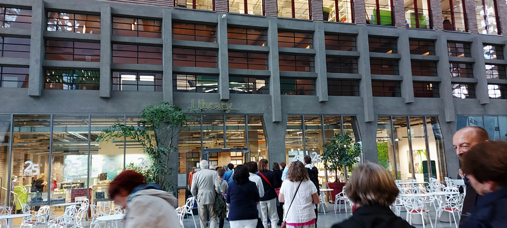 Die Bibliothekarin, die uns führte, zeigte zuerst einige Räume und exemplarische architektonische Blickpunkte, bevor es in die Bibliothek ging. Diese befindet sich auf derselben Ebene wie die Cafeteria. Beide Räume gehen ineinander über und können für besondere Veranstaltungen genutzt werden. Die Bücherei hat viel Platz und ist auch dafür gedacht, dort zu zu arbeiten. Es gibt angeschlossene Konferenzräume und einen „Stille-Raum“.