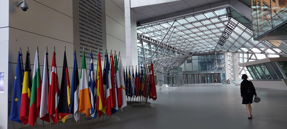 Im Eingangsbereich hingen die Fahnen der 20 Staaten, die den €uro als Währung haben: Belgien, Deutschland, Estland, Finnland, Frankreich, Griechenland, Irland, Italien, Kroatien, Lettland, Litauen, Luxemburg, Malta, Niederlande, Österreich, Portugal, Slowakei, Slowenien, Spanien, Zypern.